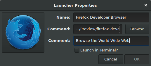 [Desktop Entry]Comment=Browse the World Wide WebTerminal=falseName=Firefox Developer BrowserExec=~/Preview/firefox-developer/firefox --profile ~/.mozilla/firefox/xxxxxxxx.default %UType=ApplicationIcon=~/Preview/firefox-developer/browser/icons/mozicon128.pngCategories=Network;