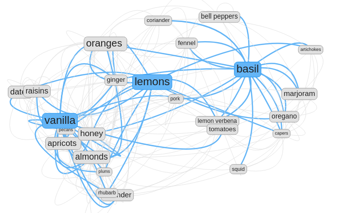 This tool allows you to explore the flavor network, a social graph for flavor profiles. The network is based on the Flavor Bible and soon the companion book What to Drink with What You Eat.